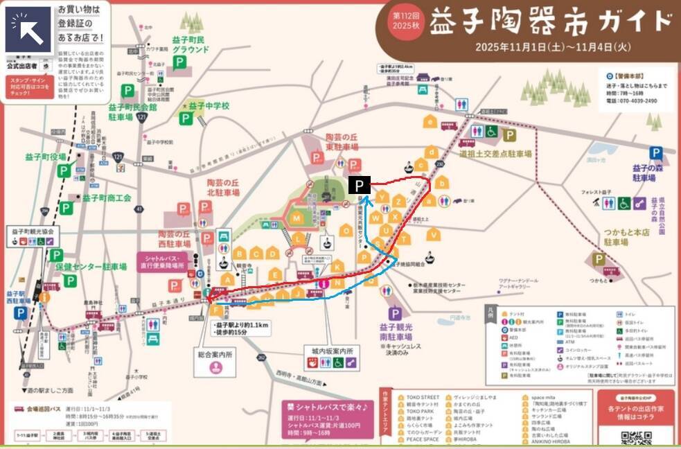 地図上の赤と青の線が重なっている部分が一番混雑しており、私たちは無計画で青い線を逆流してずっと人ごみの間を動いていたのですが、今考えると、Xのサンランド広場から共販センター近くに、徒歩でしか行けない近道があり、そこを通って下の地図赤い線のように移動すればよかったなと思います。